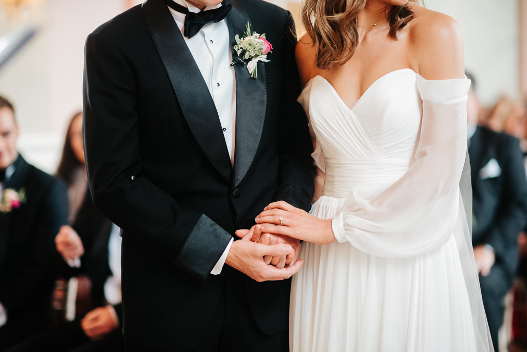 Georgia looked absolutely gorgeous in Suzanne Neville’s ‘Molly’ dress; with with its billowing, side split skirt, off-shoulder cut and delicate chiffon sleeves. James looked super suave in black tie.