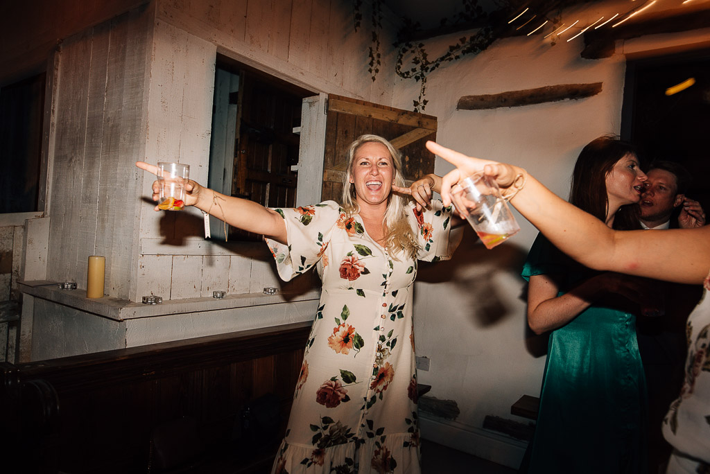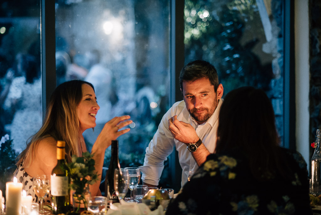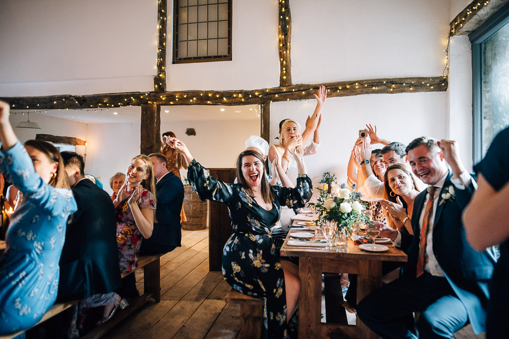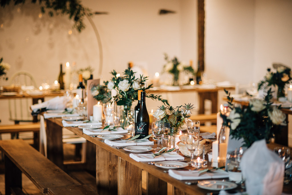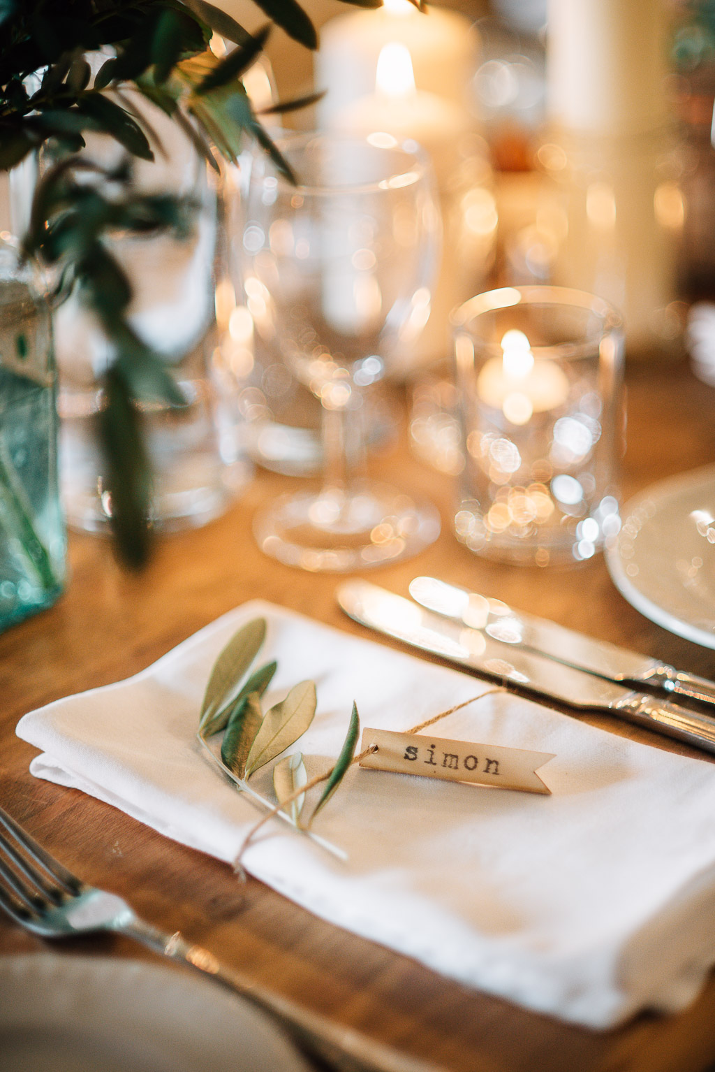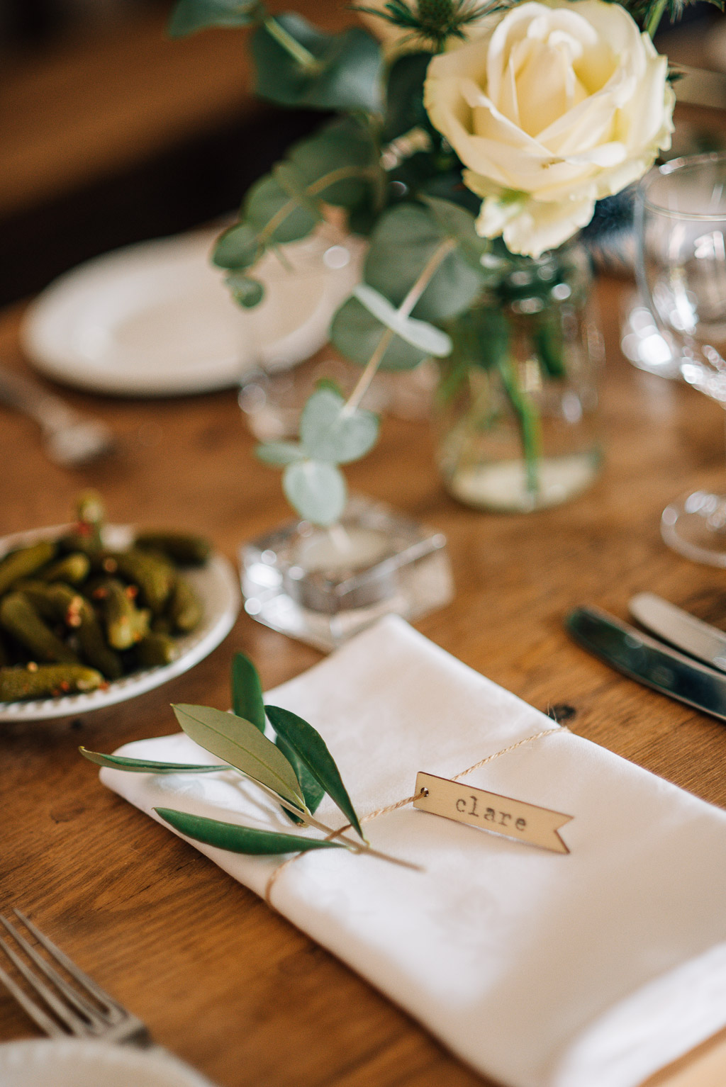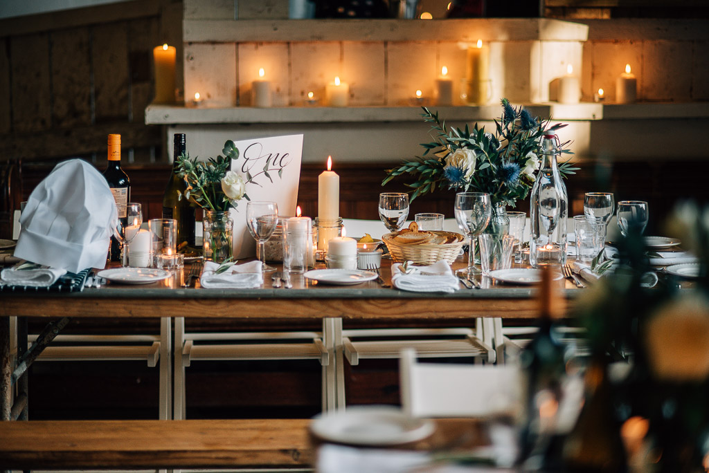 Following the church ceremony, guests ambled a short way along the country road to Paddock Barn; a gorgeous little venue with the most incredible views, decked to perfection with greenery and lots of candles. The tables looked fantastic. On the menu were beef and veggie wellingtons served with lots of roasted veg. The wellingtons were shared in tables of 6 and I loved that each table had one chef’s hat and a great big knife placed on the designated ‘server’s’ place. Who would have this honour had clearly been thought through as I witnessed the zeal with which the hats were worn and knives brandished at the ready!