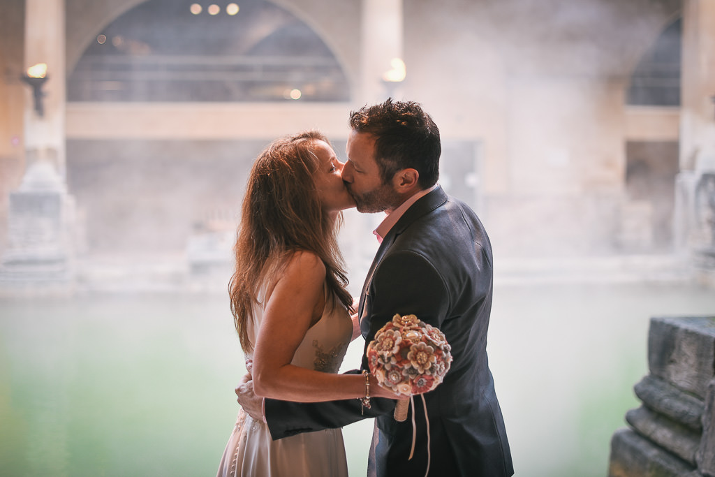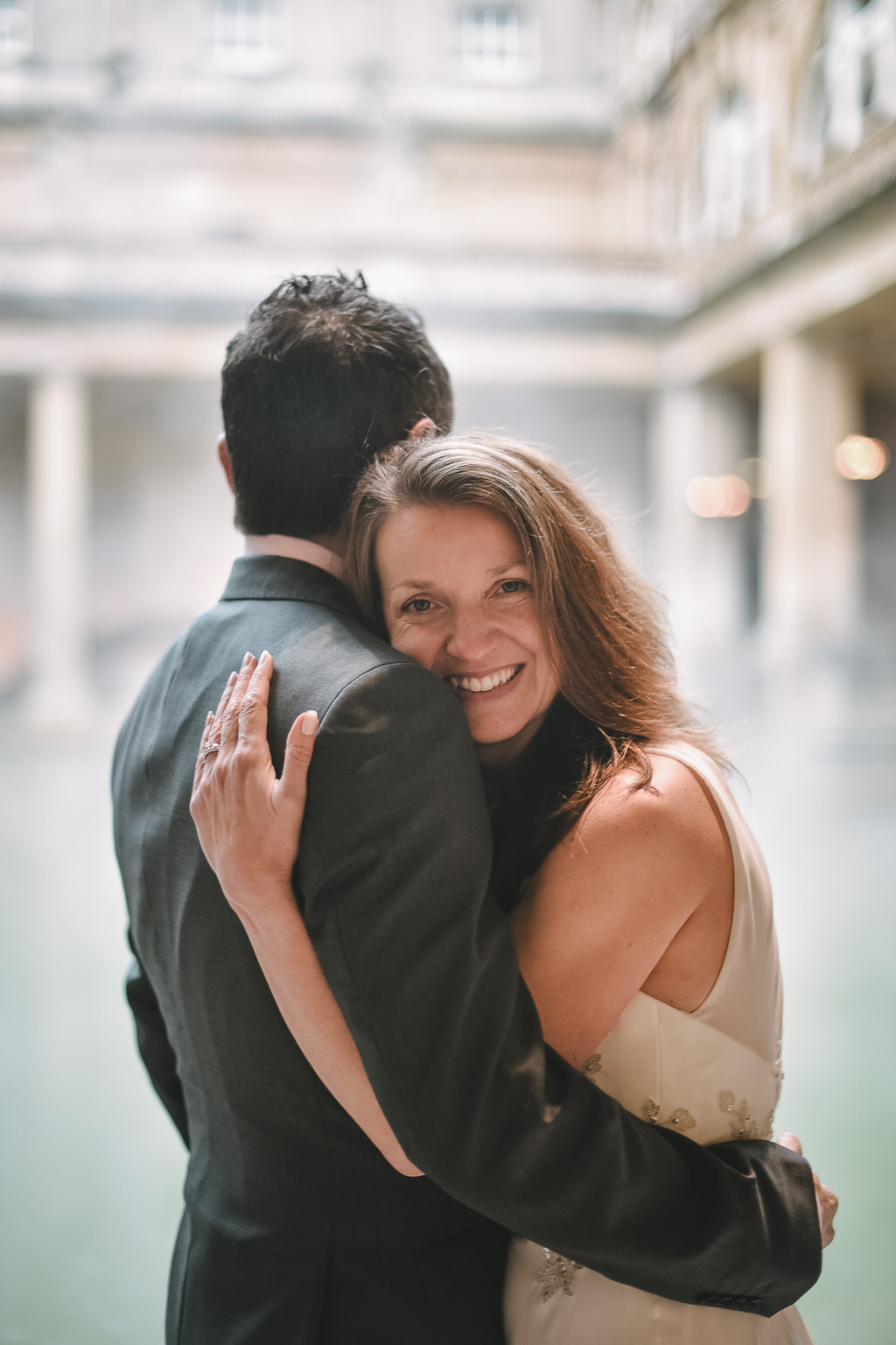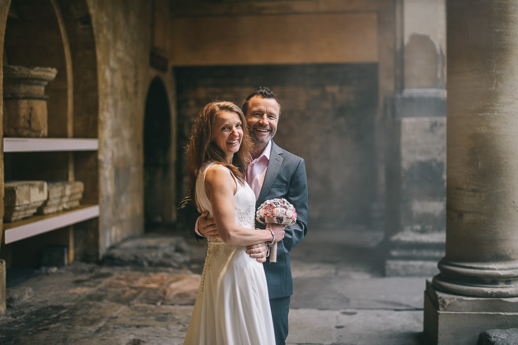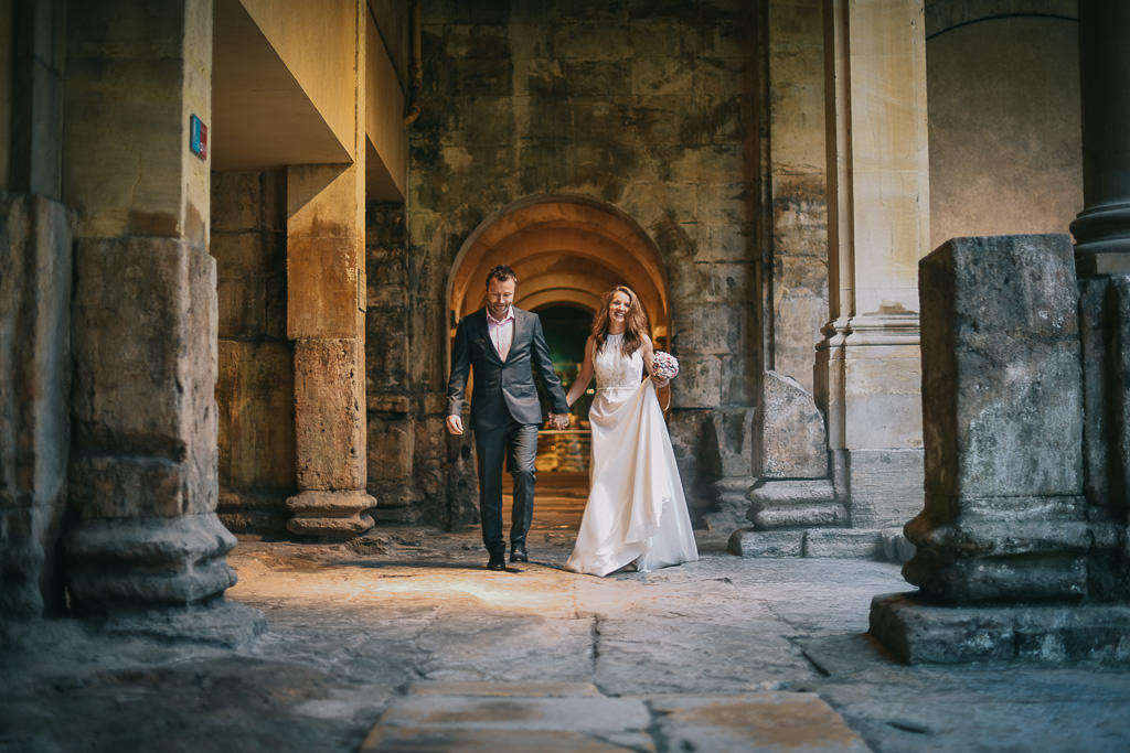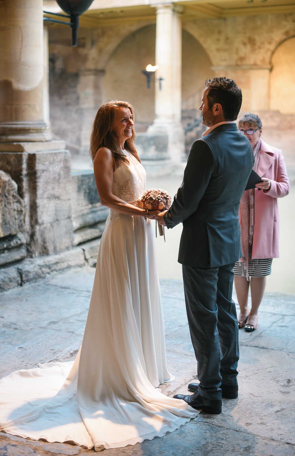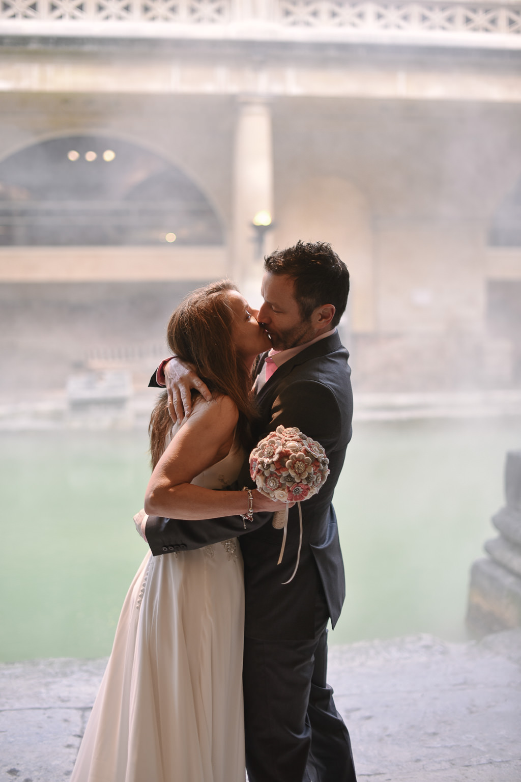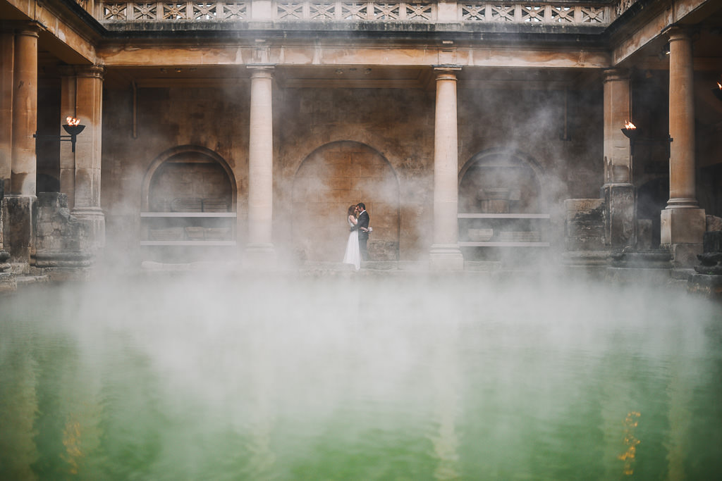 Sarah & David’s wedding was the second wedding I’d photographed, yet 4 years later I still get so many comments on ‘that’ winter Roman Baths wedding and find it crops up in all sorts of places online. The atmosphere was so spectacular and everything you’d hope for a sunrise wedding at the Baths. The cold, crisp December air meant the steam coming off the water was better than ever and added so much drama to the occasion. With the normally busy streets of Bath completely quiet, and their having just two witnesses, Sarah & David’s wedding was set in such a calming and quietly beautiful setting – it felt perfect.